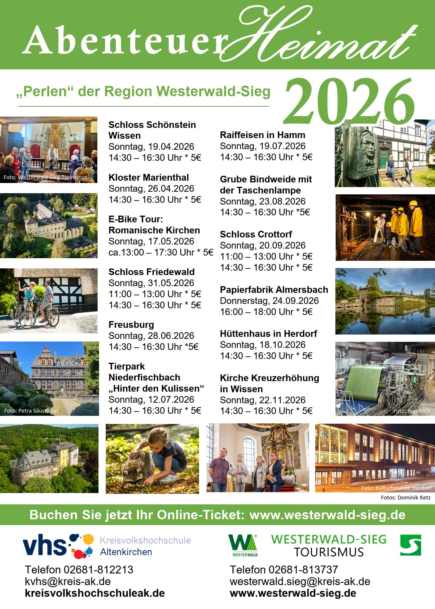 Bei allen Führungen gibt es eine begrenze Teilnehmerzahl. Anmeldungen sind ab sofort unter kvhs@kreis-ak.de, Tel. 02681 812213 möglich. Erwachsene zahlen pro Exkursion 5 Euro, Kinder bis zwölf Jahre 2 Euro. Nach der Anmeldung und vor dem Termin erhalten alle Teilnehmenden eine Abschlussinformation.