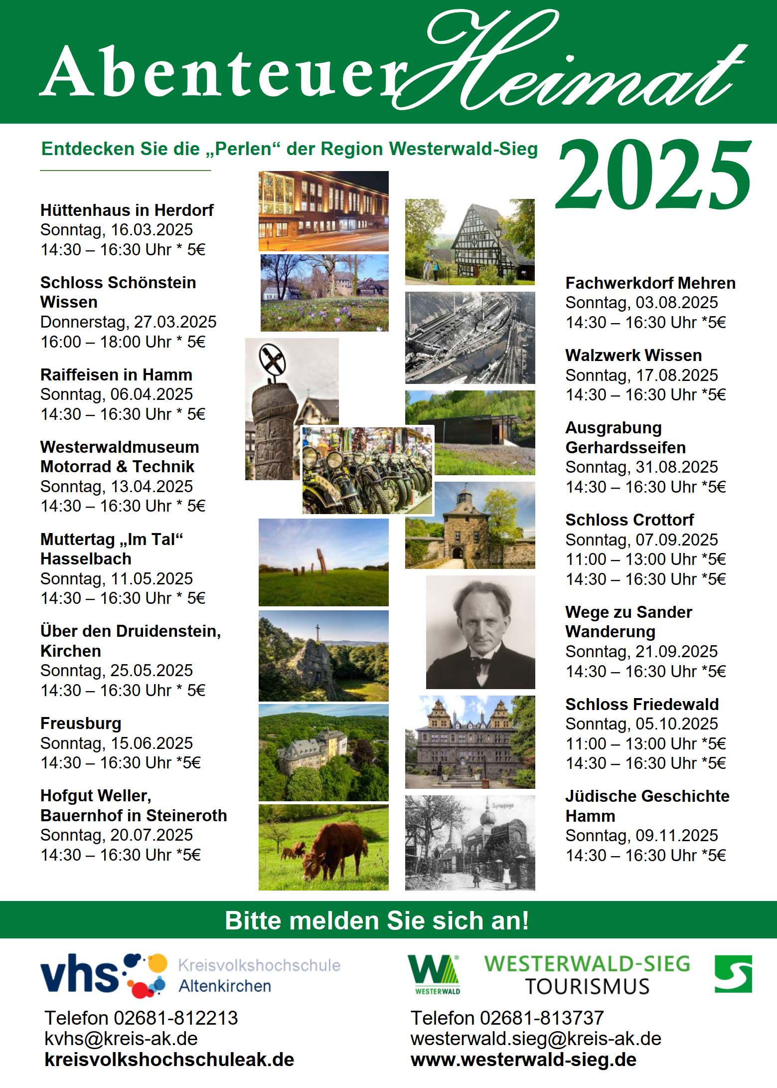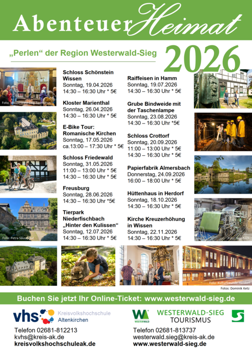 Die Kreisvolkshochschule Altenkirchen und der Westerwald-Sieg Tourismus laden wieder zu „Abenteuer Heimat“ ein. Auf die Teilnehmenden warten erneut spannende Geschichten an außergewöhnlichen Orten sowie einzigartige Einblicke in die Kultur und Historie dieser Region. Ob Schlösser oder verborgene Naturschätze – die Reihe entführt an Plätze, die oft nicht öffentlich zugänglich sind.